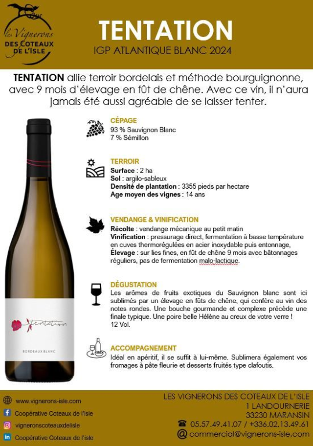 Le Tentation 2024, assemblage de Sauvignon blanc et de Sémillon, est élevé 9 mois en fût de chêne. Notes rondes, arômes de fruit exotique, bouche gourmande et complexe avec une finale typique de vin vieilli en barrique ! 12°